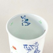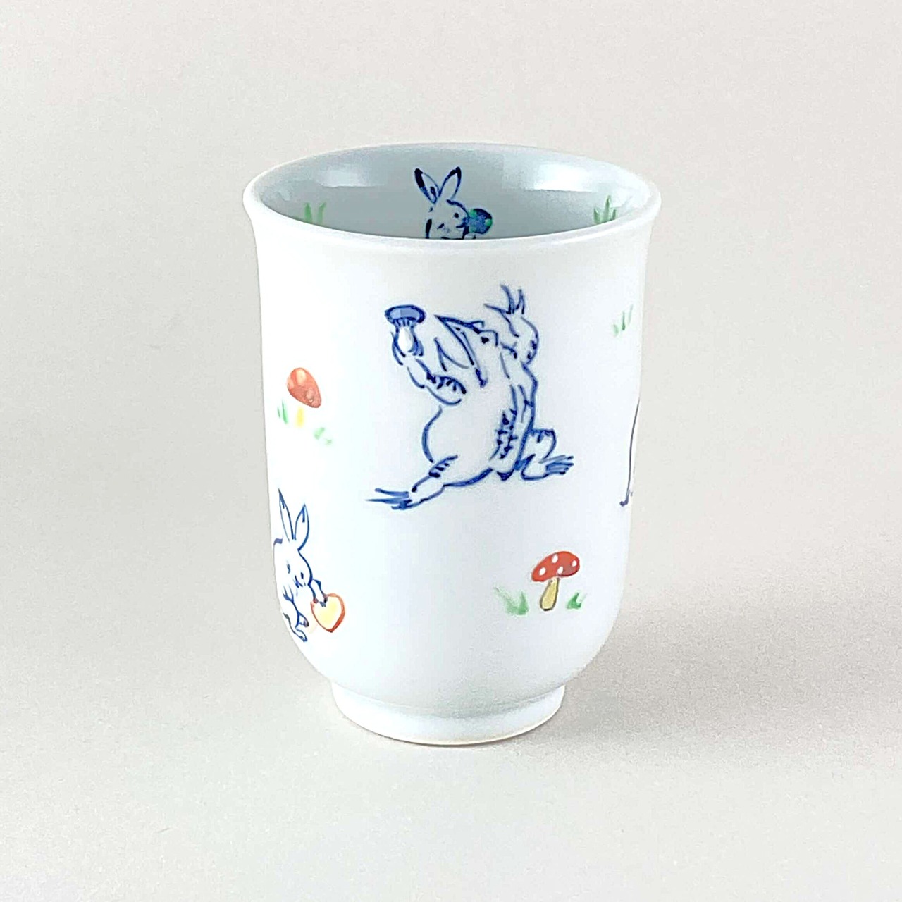 擬人化した動物達が遊戯する様をコミカルに描いた、日本最古の漫画である「鳥獣戯画」を現代風にアレンジしています。きのこ狩りをしているうさぎとカエルを描いています。
