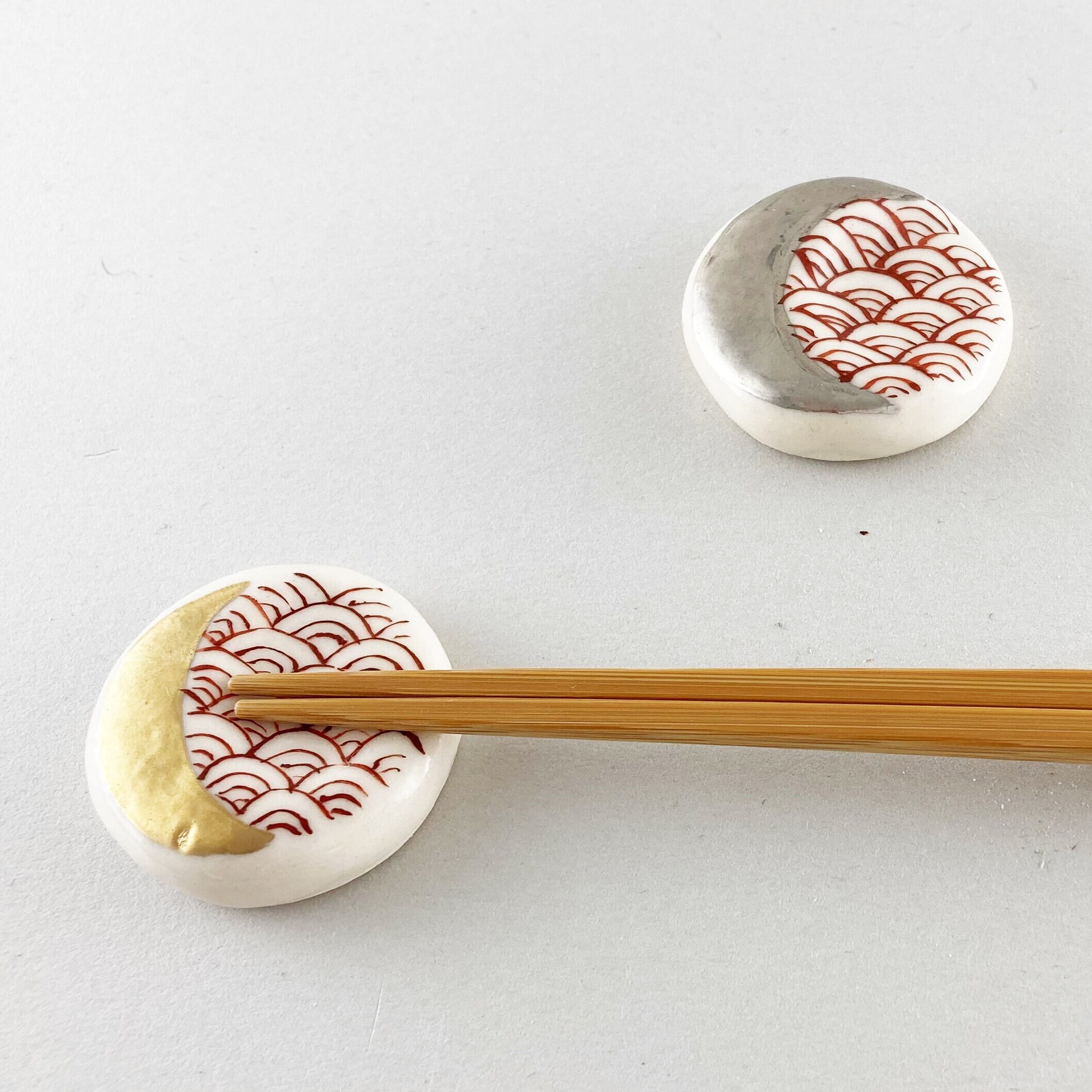 波に月がうつる様を小さな箸置きに描いています。月は金と白金の2種類で上品な雰囲気です。