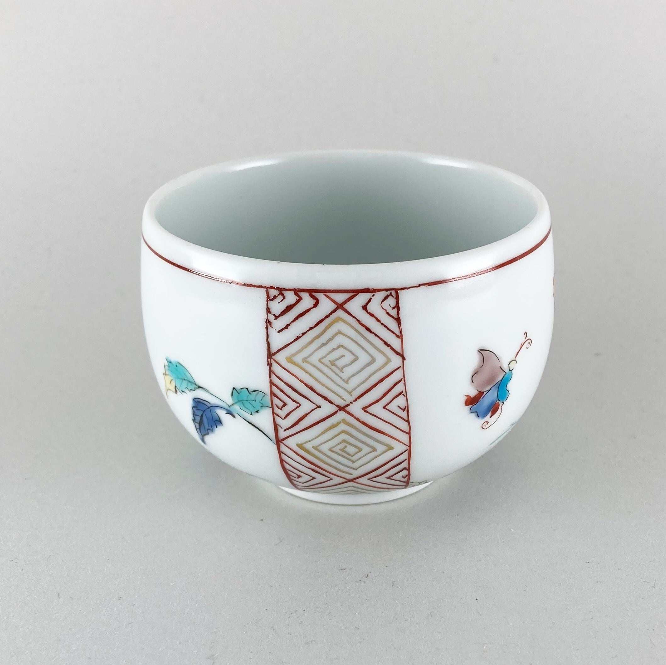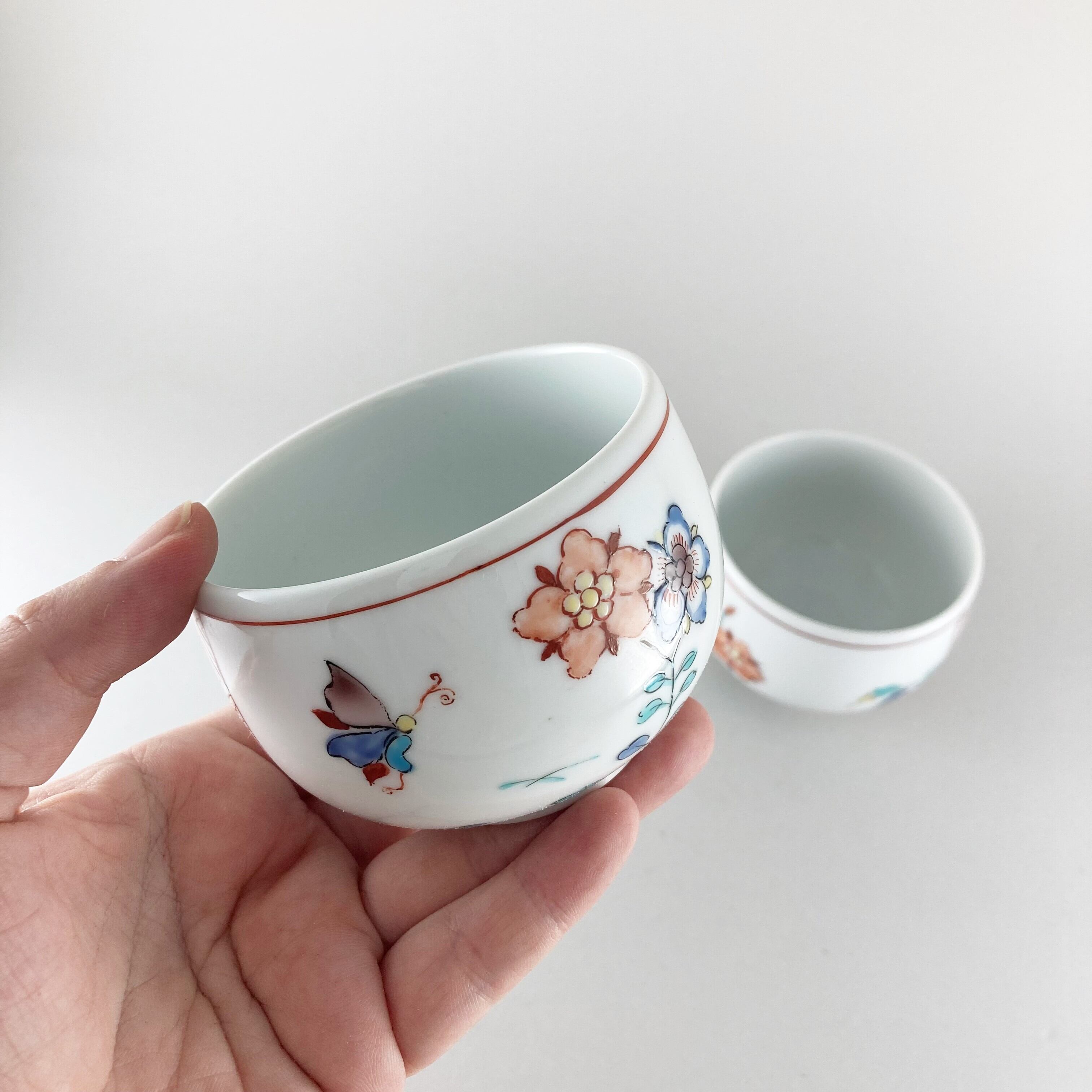 湯呑の外側に花と蝶を描いた落ち着いたデザインの湯呑です。