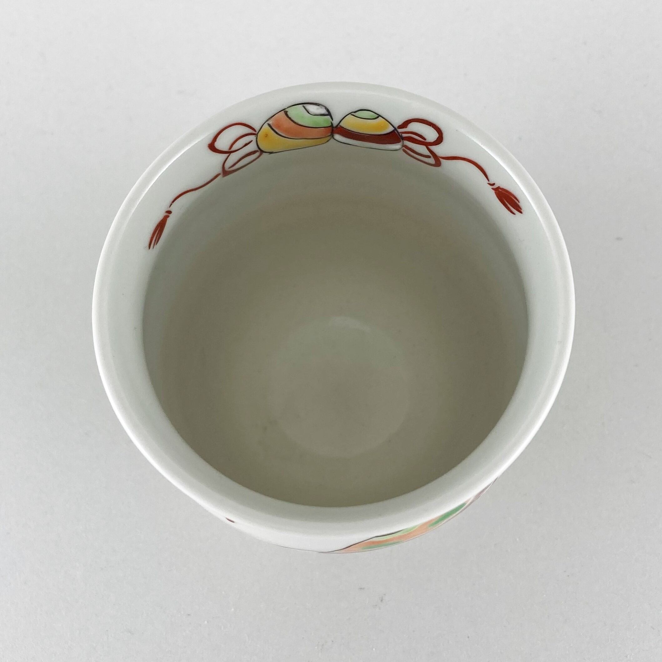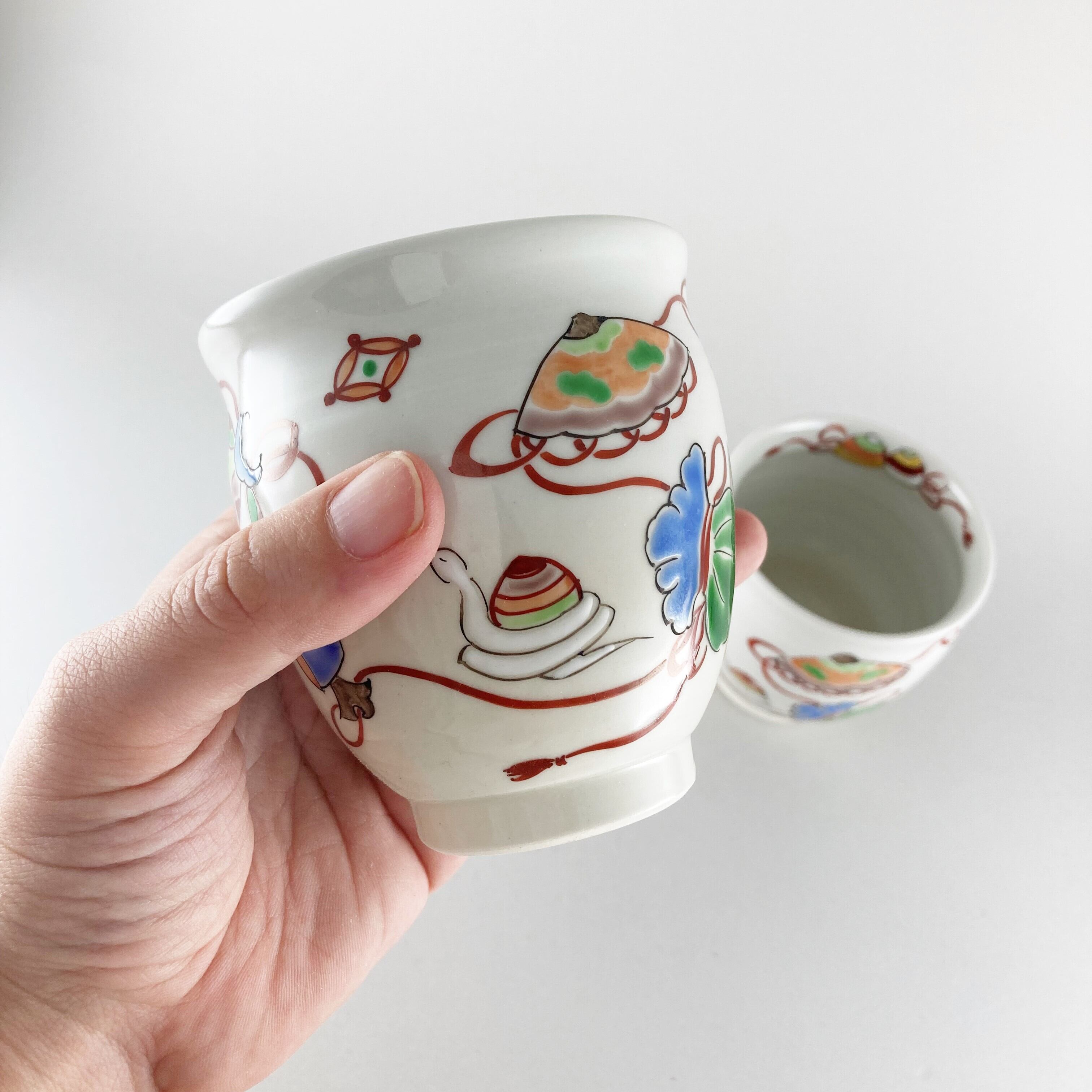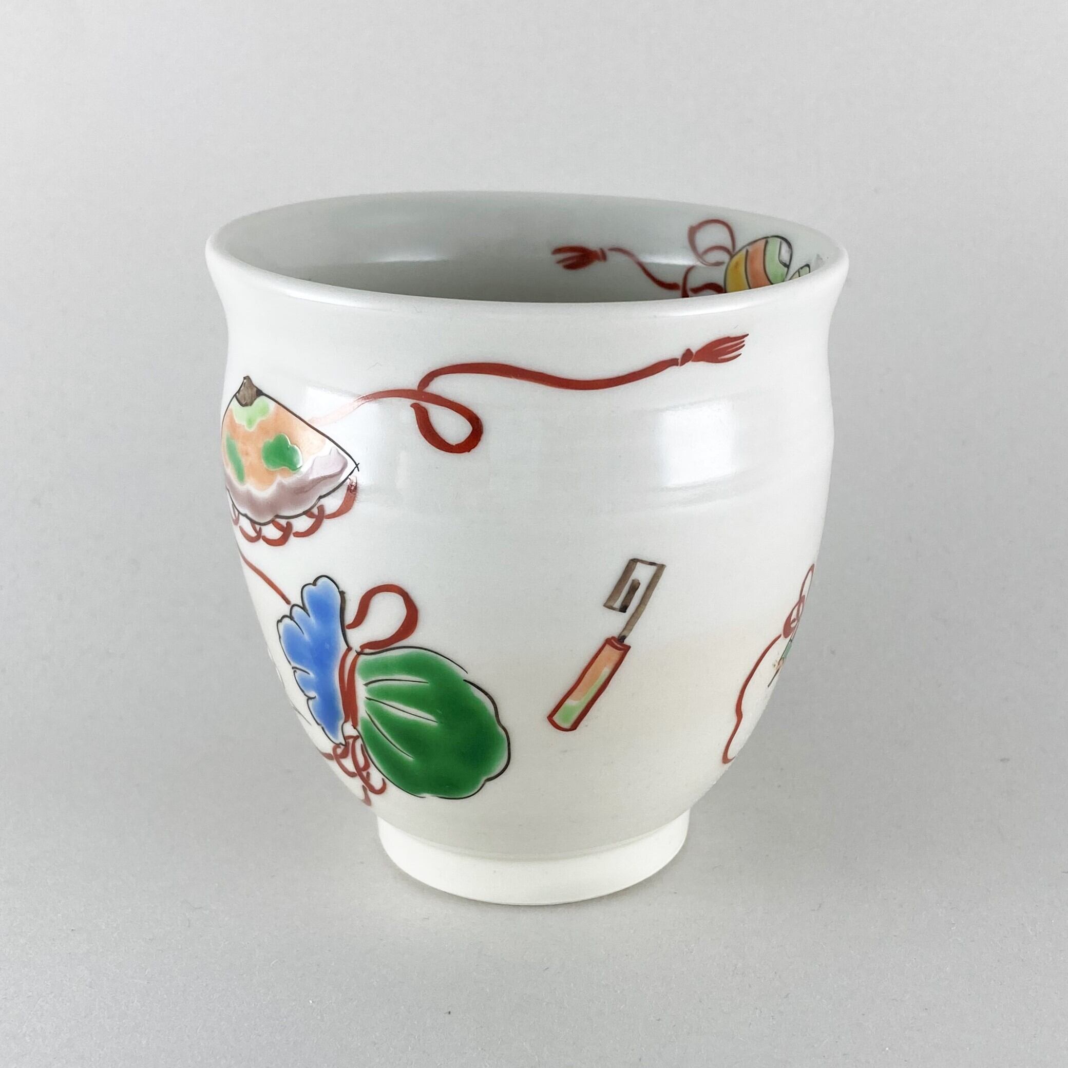 巳と宝尽くしを描いたおめでたい柄の湯呑です。